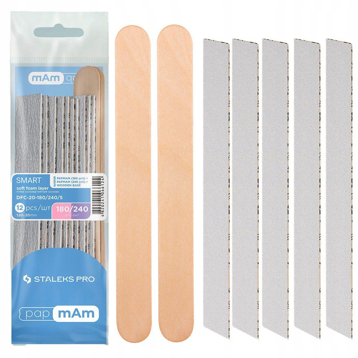 Sistema PapmAm: limas de papel prontas a usar, encaixadas numa base de madeira. O formato tipo “capa” permite um trabalho muito seguro, sem ferir a unha nem a pele do dedo. Após a utilização, a recarga PapmAm é descartada ou pode ser entregue à cliente. O sistema é totalmente sem cola, económico e prático — uma solução patenteada pela Staleks.