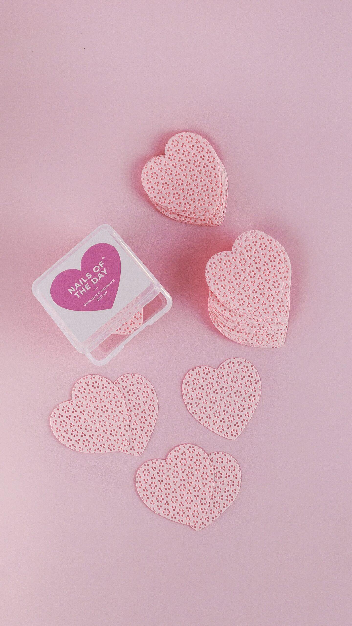 Toalhitas sem fiapos em forma de coração da Nailsoftheday, da coleção Kupidon. Em caixa plástica, agradáveis ao toque. Usam-se para remover verniz gel e a camada pegajosa, bem como para desengordurar a unha. Não deixam fibras, tornando o processo mais limpo e confortável.