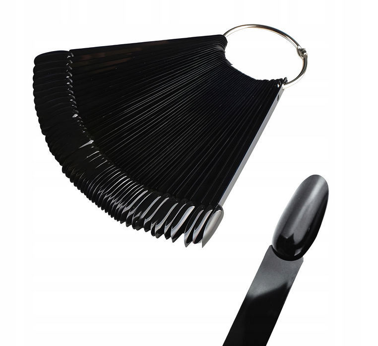 Amostrário elegante em preto, em formato amêndoa, ideal para apresentar vernizes, gels e efeitos especiais, como pós e películas. O conjunto inclui 30 tips num anel prático, que facilita a organização e a apresentação das amostras.