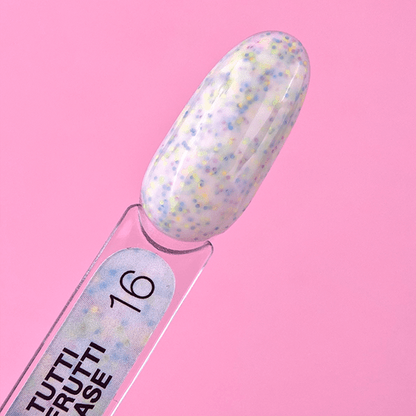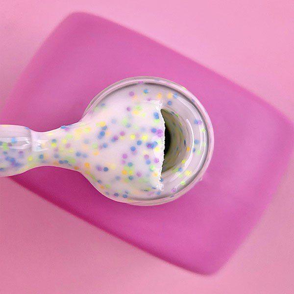 LUNAMOON TUTTI FRUTTI BASE é uma base de camuflagem leitosa com pintas multicoloridas, que substitui totalmente o verniz de Gel.