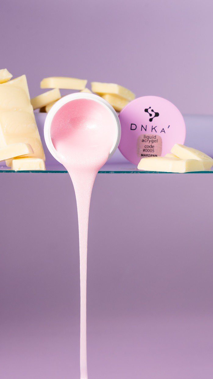 DNKA Liquid Acrygel é uma linha de géis líquidos para reforço da placa ungueal. Com baixa acidez, é seguro para as unhas e indicado para unhas finas e sensíveis. Tem consistência média, nivela bem e reforça unhas curtas e longas. Não deforma durante o uso e mantém o brilho até à correção. Para melhor adesão, recomenda-se aplicar uma camada fina de DNKA’ Rubber Base como base.