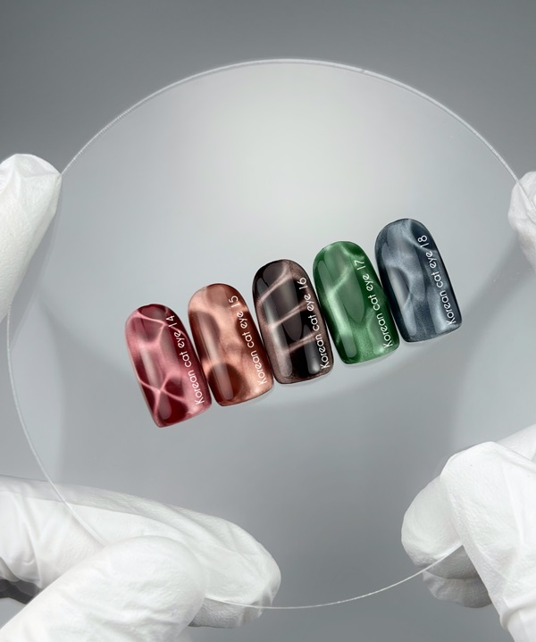 - Aplicação do verniz: distribua uniformemente o verniz gel NAILSOFTHEDAY Korean Cat Eye 18. Para obter o efeito “olho de gato”, use um íman adequado.