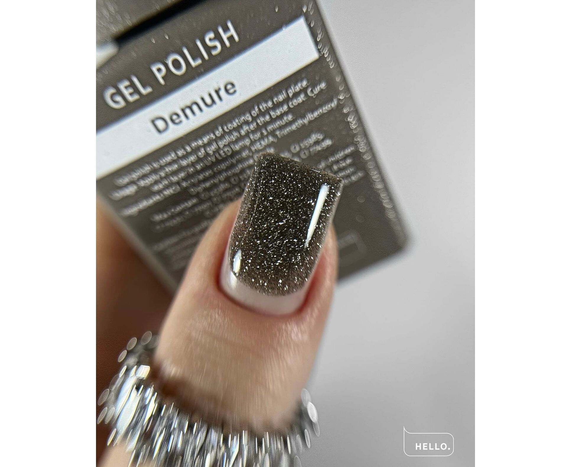 HEYLOVE Demure é um verniz gel elegante em tom bege acinzentado, com brilho holográfico subtil e partículas refletivas. Combina a delicadeza do nude com um efeito flash moderno, perfeito tanto para o dia a dia como para ocasiões especiais. Ideal para quem gosta de tons discretos, mas com impacto.