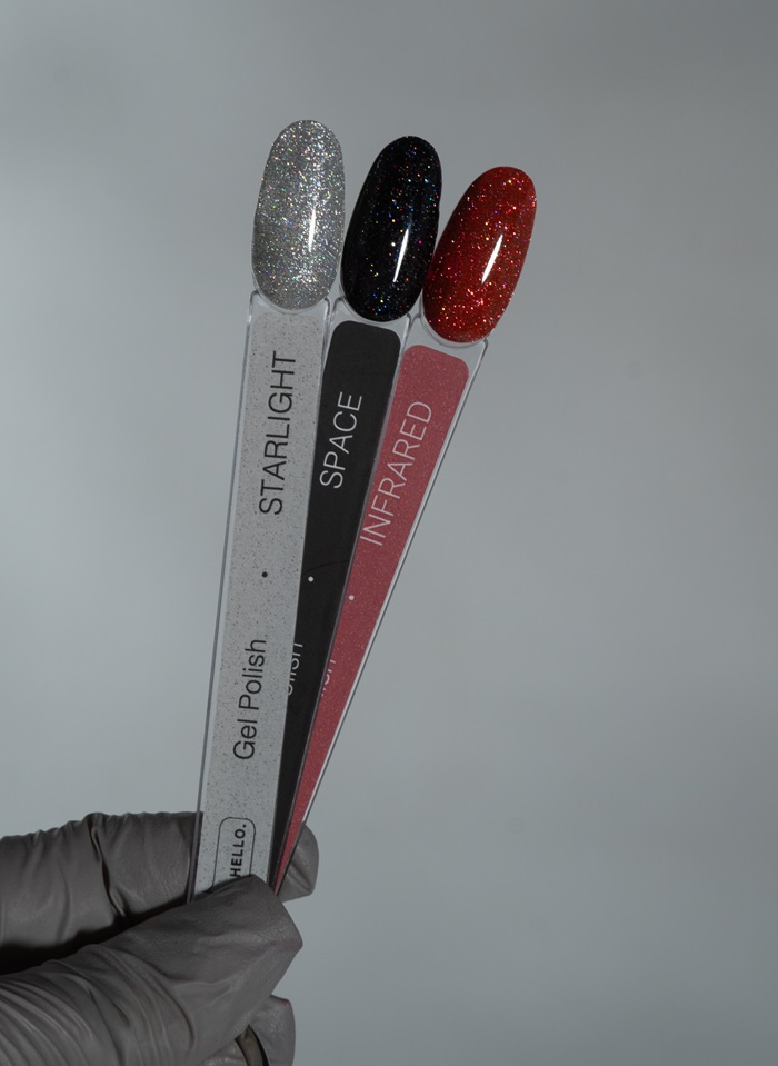 HEYLOVE Infrared é um Verniz de Gel com efeito flash: partículas holográficas e refletoras criam um brilho intenso, bonito à luz do dia e ainda mais marcante com flash.